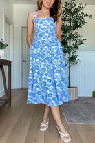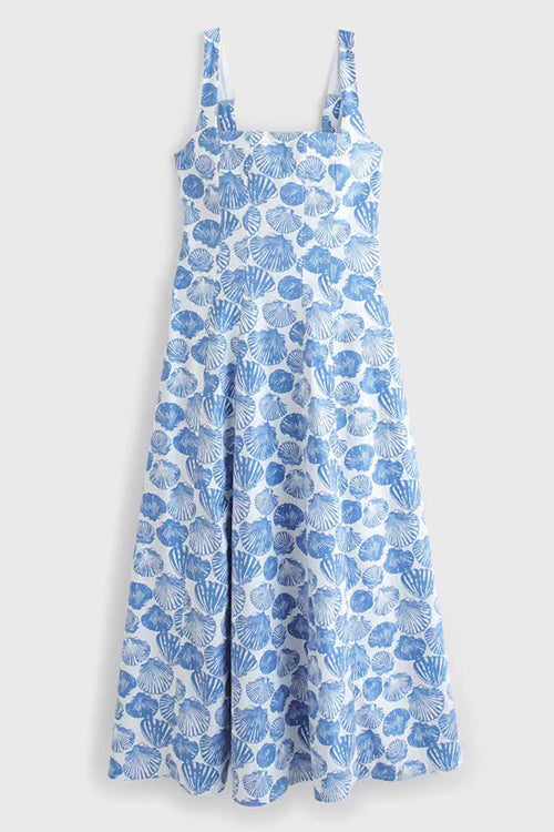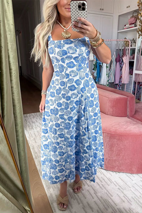 Square Neck Sleeveless Shell Print Pocketed Midi Dress