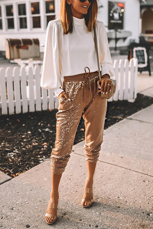 Drawstring Waist Pocketed Sequin Joggers