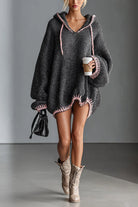 • Experience effortless style with the Drawstring Hooded V Neck Lantern Sleeves Mini Sweater Dress. This cozy knit dress features a flattering V neckline and statement lantern sleeves that add a touch of drama to your look. The hood with adjustable drawstrings offers a laid-back, chic vibe, while the mini length keeps it playful and modern. Perfect for casual outings or cozy days in, this dress combines comfort and trend-right details to keep you looking and feeling your best.