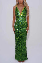 Make a statement in this stunning V-neck sequin bodycon maxi dress. The daring cutout detail at the neckline adds modern sophistication, while all-over sequins catch the light with every movement. The fitted silhouette hugs your curves beautifully, creating an elegant, elongated line perfect for evening events and celebrations. Adjustable cami straps ensure a comfortable, customized fit. Whether you're heading to a party, gala, or special occasion, this show-stopping dress delivers glamour and confidence in one unforgettable package.