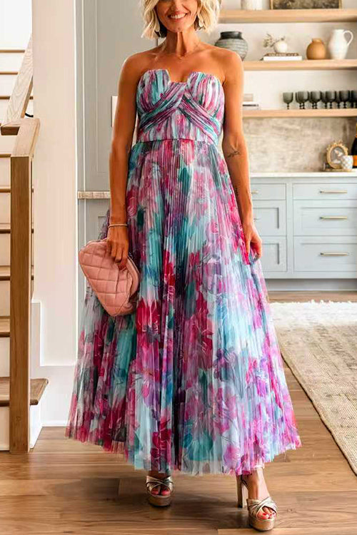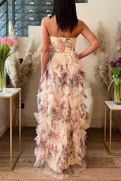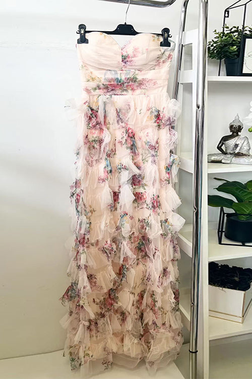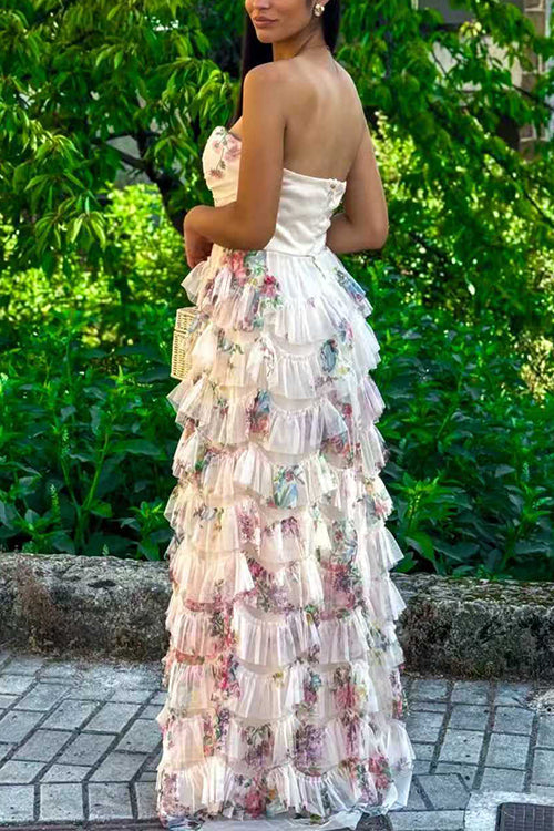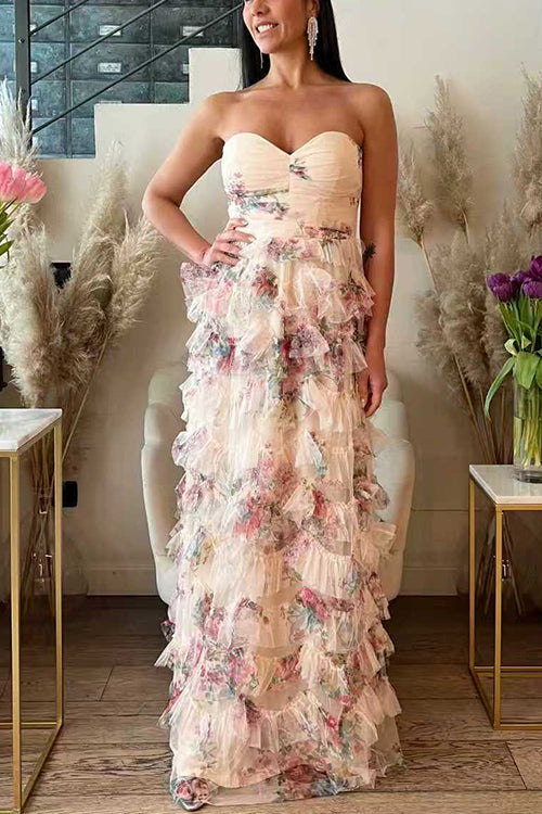 Strapless Floral Print Ruffle Layered Maxi Dress