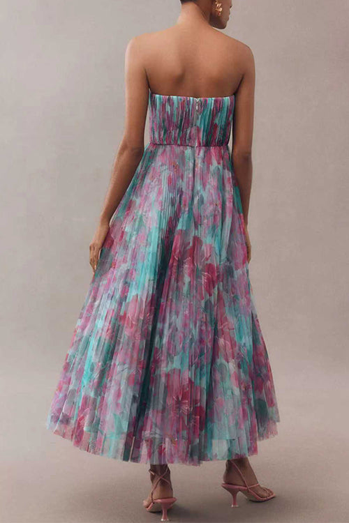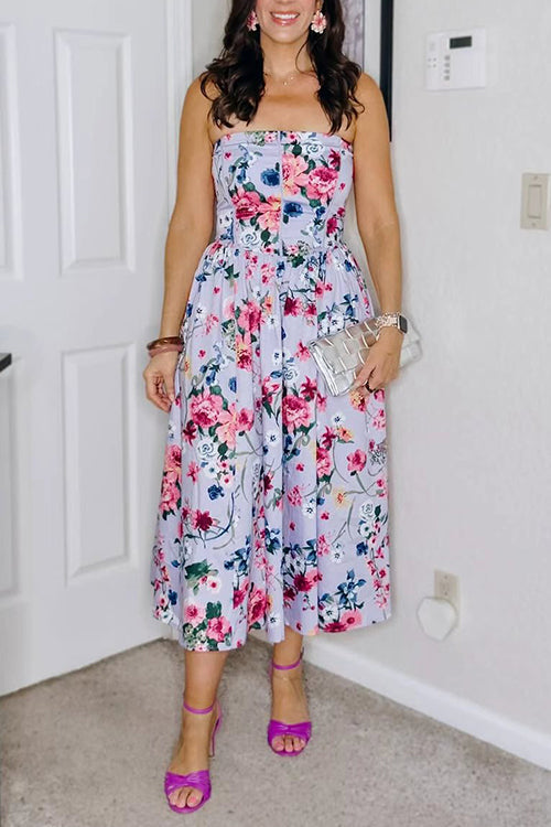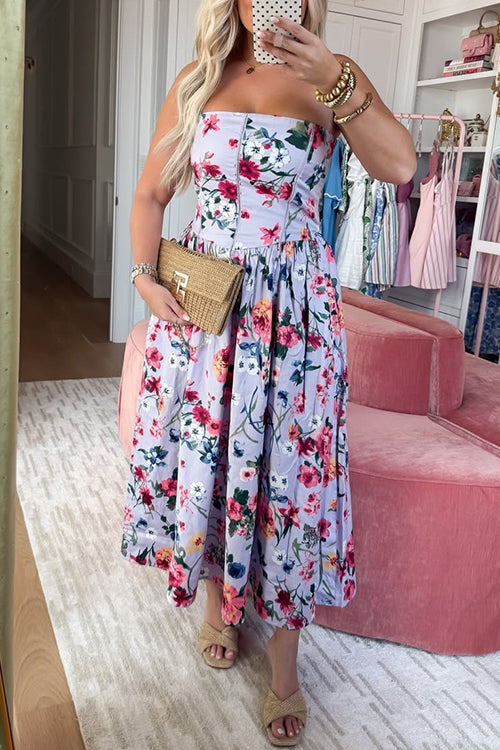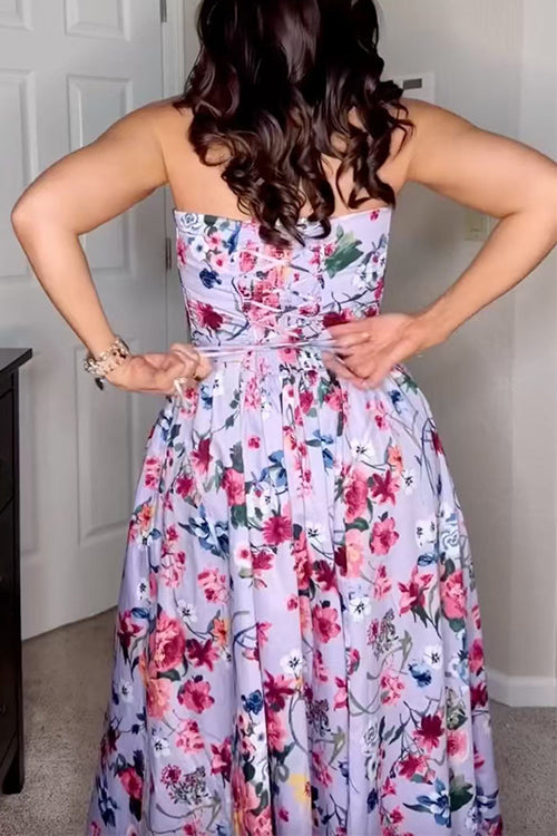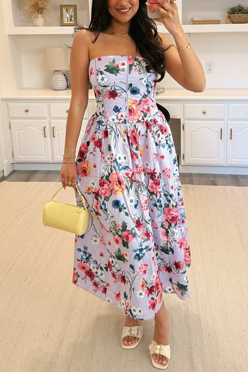 Strapless Tube Back Lace-up Floral Print Midi Dress
