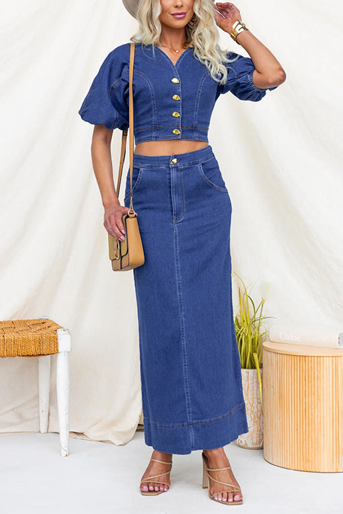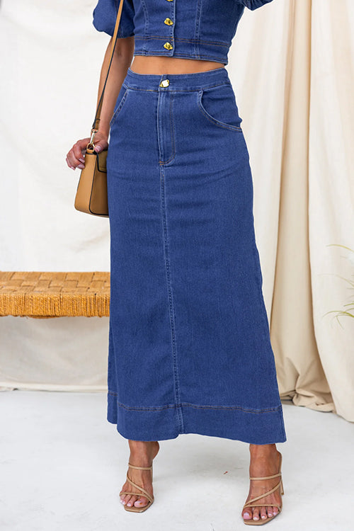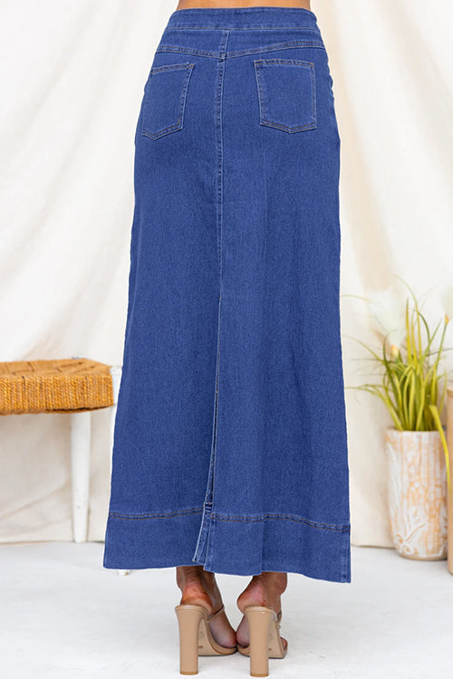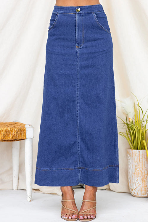 High Rise Back Slit Pocketed Denim Maxi Skirt