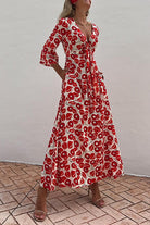 Tie Knot V Neck 3/4 Sleeves Abstract Print Maxi Swing Dress