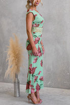 Asymmetrical Shoulder Lace Splice Floral Print Maxi Dress
