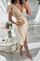 Dazzle in our Heididress V Neck Flare Sleeves Slit Bodycon Sequin Midi Dress! The deep V neck, flared sleeves, and sexy slit elevate the classic bodycon silhouette, while the sparkling sequins add a touch of glamour. Perfect for a night out, prom, or any special occasion.