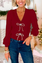 Achieve a sweet, timeless look with this V Neck Bow Knot Front Sweet Sweater. Its V neck and bow knot detail create a sleek silhouette and add a touch of femininity to any ensemble. Crafted with care, it'll keep you warm and stylish all season long.