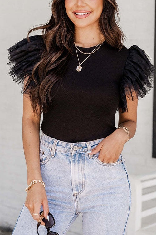 Heididress Crewneck Lace Ruffle Short Sleeves Top
