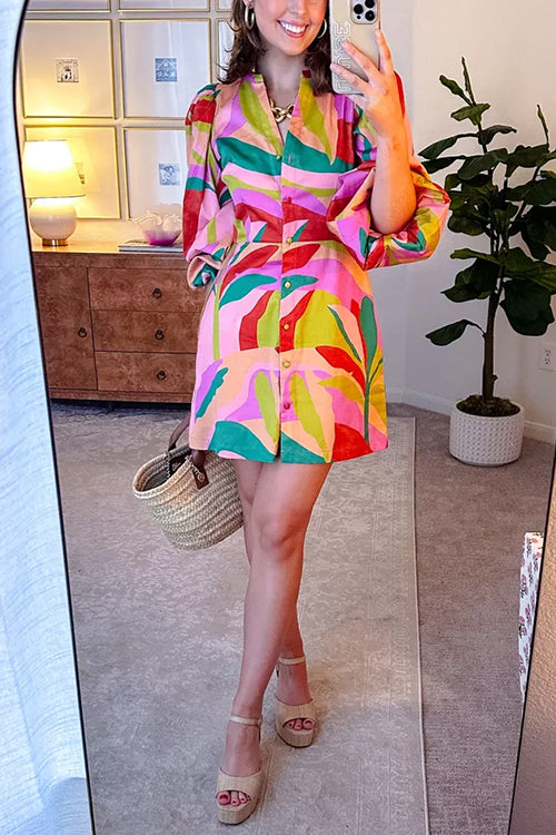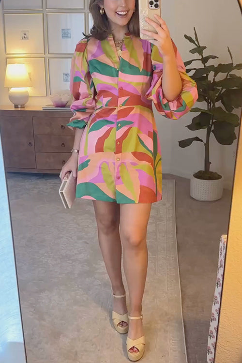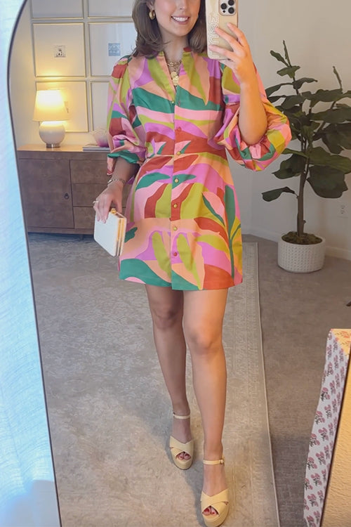 V Neck Puff Sleeves Button Down Printed Mini Dress