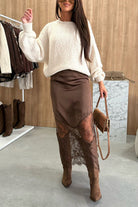 Discover elegance redefined with the High Rise Satin Splice Lace Maxi Skirt. This skirt flawlessly blends luxurious satin and intricate lace, creating a timeless piece that highlights your silhouette with a flattering high-rise fit. Its graceful, flowing design adds a touch of sophistication, perfect for making a memorable impression at any event. Embrace comfort and style in one stunning skirt that elevates your look effortlessly.