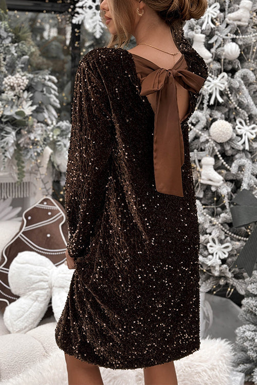 Crewneck Long Sleeves Bow Back Cut Out Sequin Dress